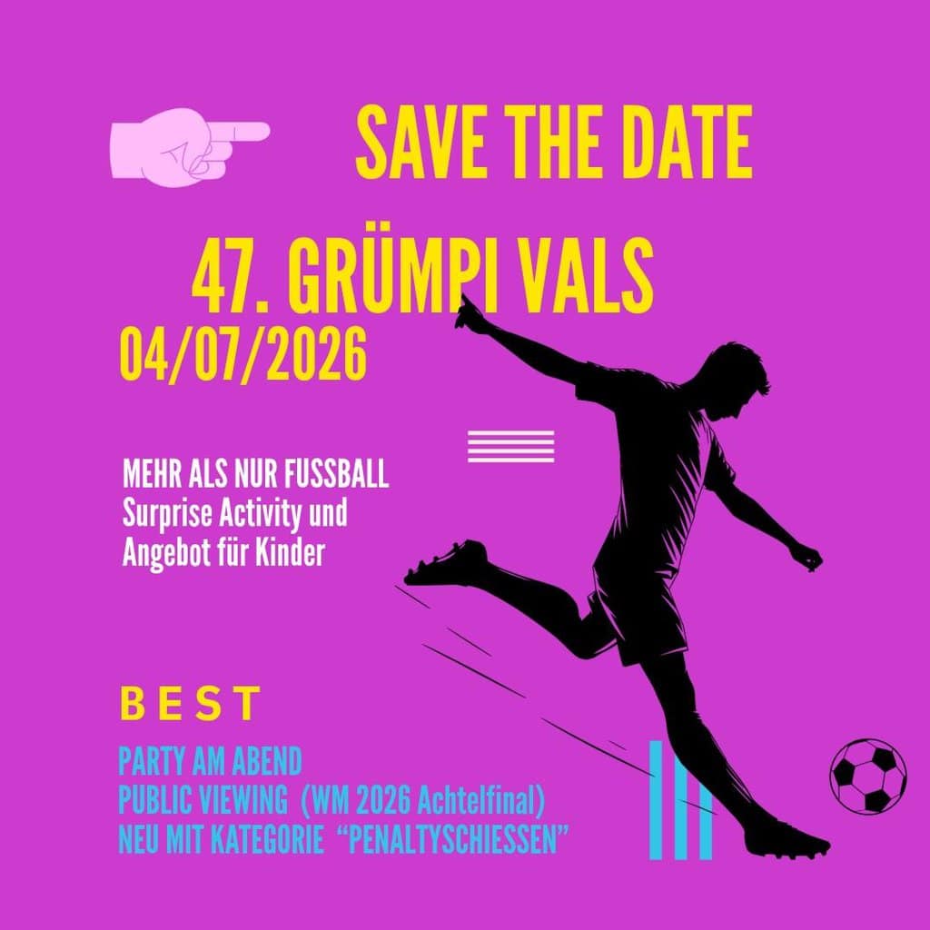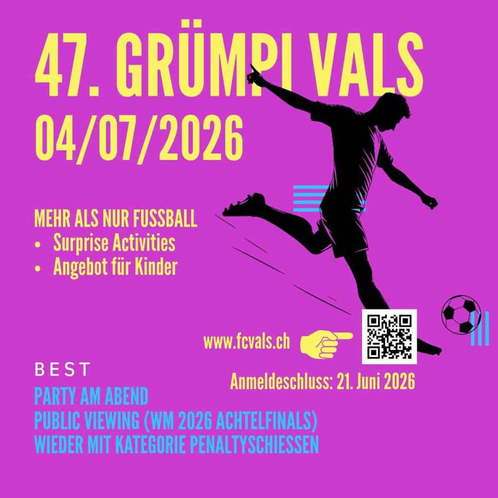 Wir freuen uns, auch dieses Jahr wieder das Grümpi in Vals durchführen zu dürfen. Das 47. Grümpelturnier des FC Vals findet am 4. Juli 2026 statt, gefolgt von der gewohnten Grümpi-Party in der Mehrzweckhalle am Abend und bis in die Morgenstunden.